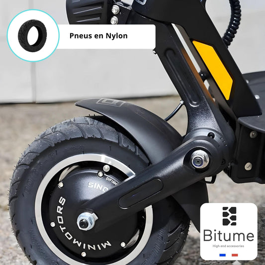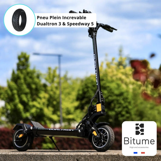 Les pneus gonflables sont les plus courants sur les modèles Dualtron. Ils offrent une excellente adhérence, une absorption des chocs optimale et une conduite plus fluide, particulièrement sur les routes irrégulières ou les chemins non goudronnés. En contrepartie, ils nécessitent une vérification régulière de la pression et peuvent être sujets aux crevaisons.